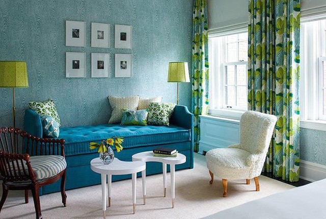 Tông màu chủ đạo nên lựa chọn là xanh mòng két để tạo cảm giác mát mẻ, thoáng đãng, sau đó điểm chấm phá với những chi tiết nội thất màu vàng chanh như một chiếc ghế tròn, rèm cửa sổ… Tuy nhiên, màu vàng chanh bao trùm sẽ là một điểm nhấn độc đáo, sống động.