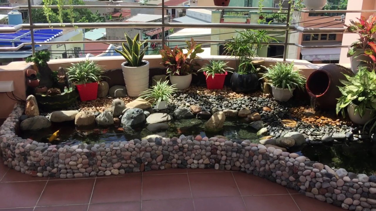 Khi nhà đã được thợ hoàn thiện và bàn giao, chị quyết định trải thêm 1 lớp bạt trên sàn trần thượng, đổ thêm đất cát lên trên, chia ô xây bệ gạch để trồng cây. Chị đã bỏ ra hàng chục triệu để mua cây cảnh, cây giống, vận chuyển đất lên sân thượng, kiến tạo bể cá. Thành quả là một khu vườn vô cùng gọn gàng, xinh đẹp với bồn hoa rực rỡ, cây bụi đan xen, một vài ruống rau xanh và nhất là một hồ nhỏ 8m2 thả cá 7 màu, đặt san hô, rong rêu trang trí.