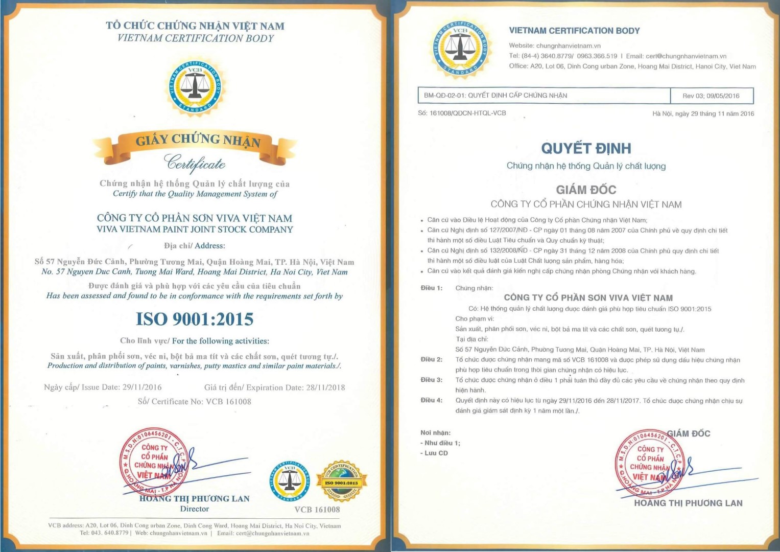 Sơn ViVa đạt chứng nhận Hệ thống quản lý chất lượng phù hợp với tiêu chuẩn ISO 9001:2015 cho lĩnh vực sản xuất, phân phối sơn, véc ni, bột bả matit và các chất sơn, quét tương tự... Đây là bộ tiêu chuẩn mới nhất, cùng với ISO 14001:2015, được Tổ chức tiêu chuẩn hóa quốc tế ISO ban hành ngày 15/09/2015. Tiêu chuẩn mới này nhấn mạnh đến định hướng thị trường và sự thân thiện với người dùng, yêu cầu đơn vị được chứng nhận phải đáp ứng đầy đủ các yêu cầu trong luật định và cả mong đợi của khách hàng, đồng thời có trách nhiệm với cộng đồng, môi trường và xã hội.