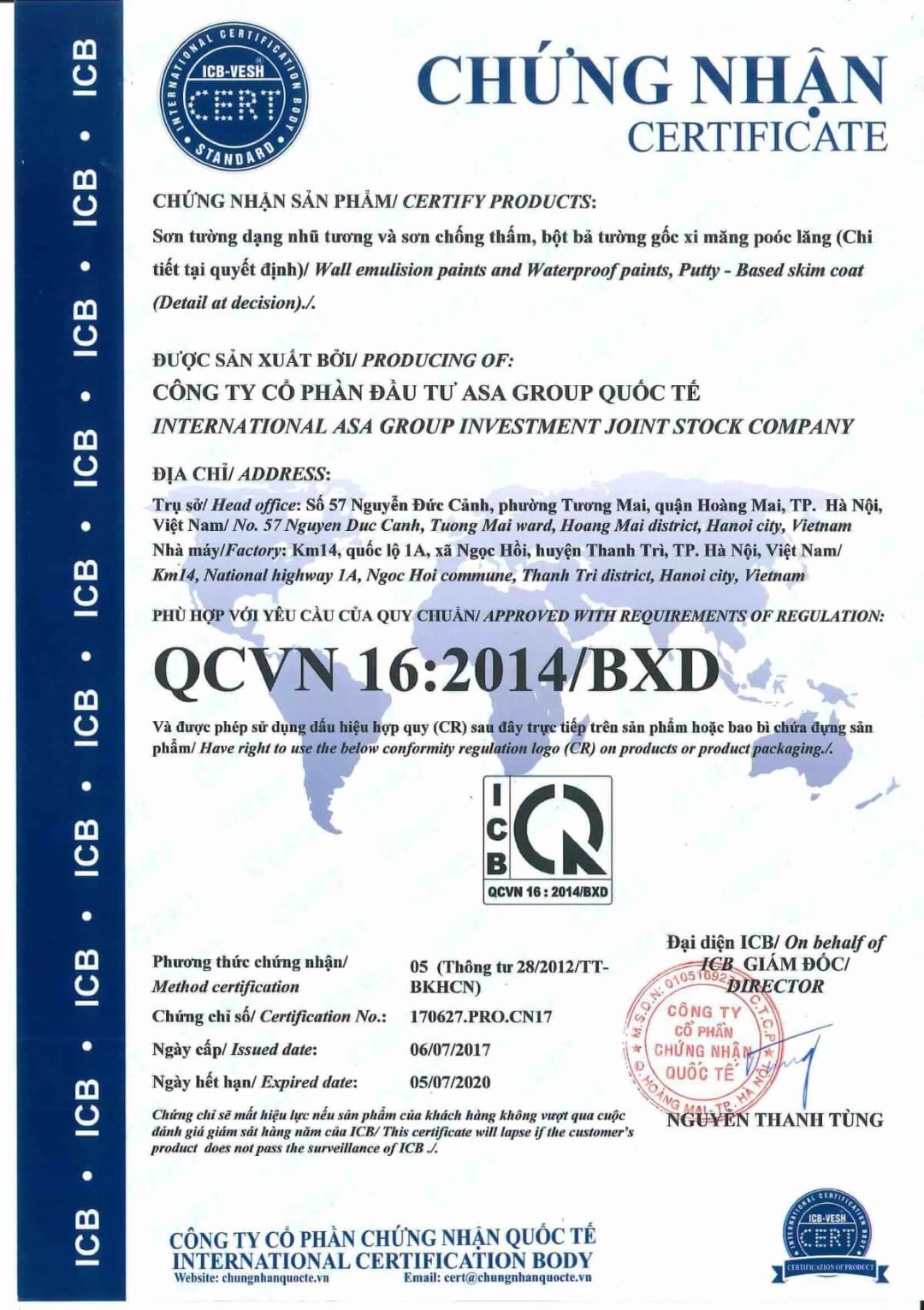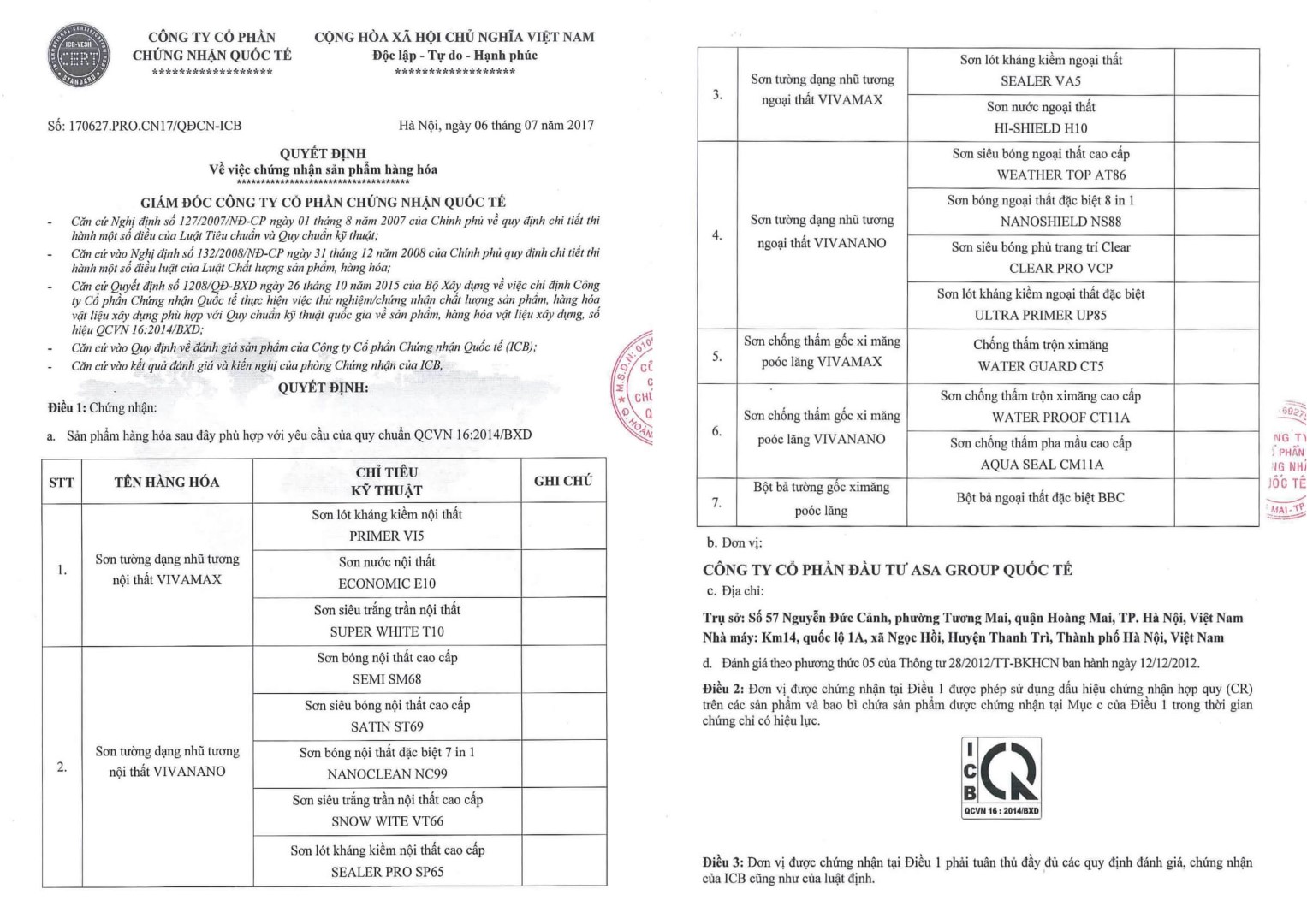 ASA Group Quốc tế đã nỗ lực hoàn thiện chất lượng toàn bộ các dòng sản phẩm đạt các chỉ tiêu trong quy chuẩn và được cấp quyền sử dụng dấu hiệu hợp quy CR trực tiếp lên sản phẩm của mình.